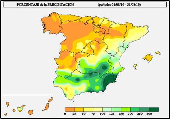 El mes de agosto ha resultado en conjunto de precipitaciones normales o algo por debajo de las normales, con una precipitación media sobre España de 18 mm. frente a un valor medio sobre el período de referencia de 23 mm. Como es habitual en los meses veraniegos, la distribución espacial de estas precipitaciones ha sido muy desigual, de forma que el mes resultó relativamente húmedo a muy húmedo en Andalucía, sur y este de Castilla